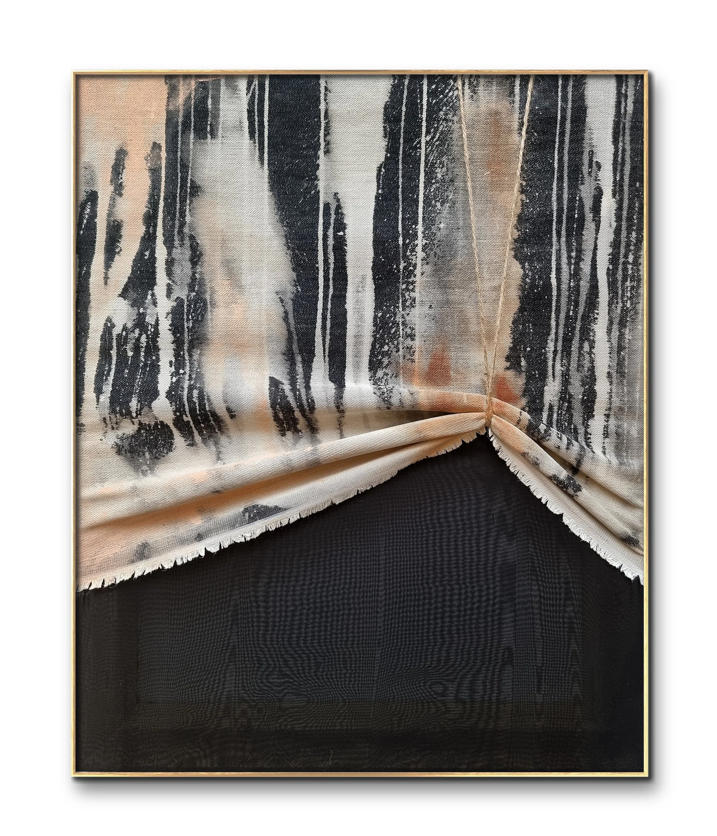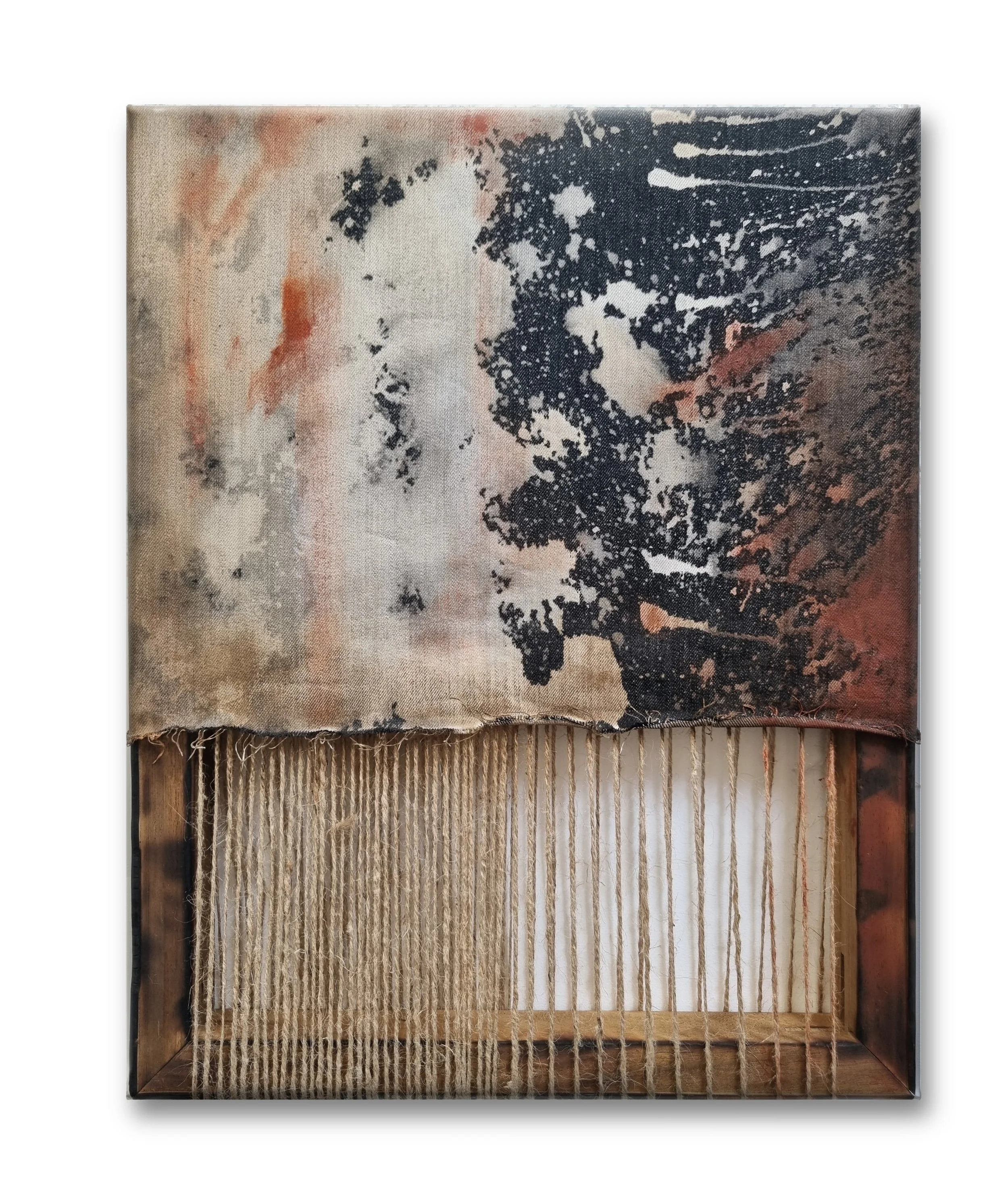 Acrilico e pittura con candeggina su tessuto in denim, corda in Juta. telaio in pino bruciato e dipinto