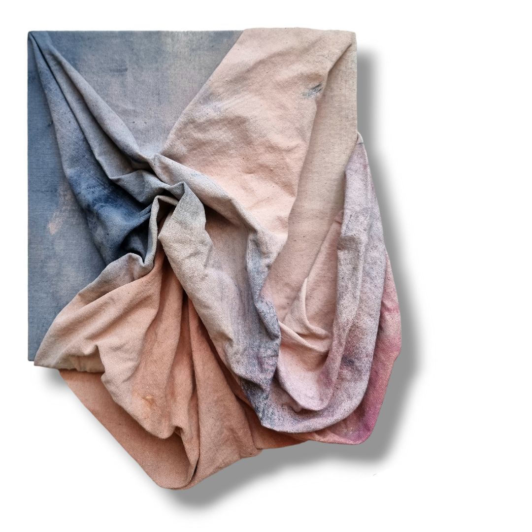 Acrilico e pittura con candeggina su tessuto in denim, base in tessuto di organza